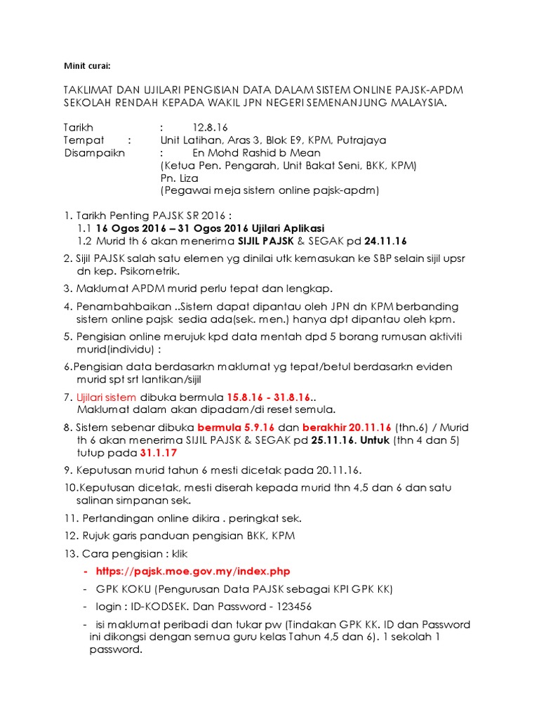 2016 08 21 Minit Curai Taklimat Bengkel 12 Ogos 2016 Di Bpm Kpm Pdf